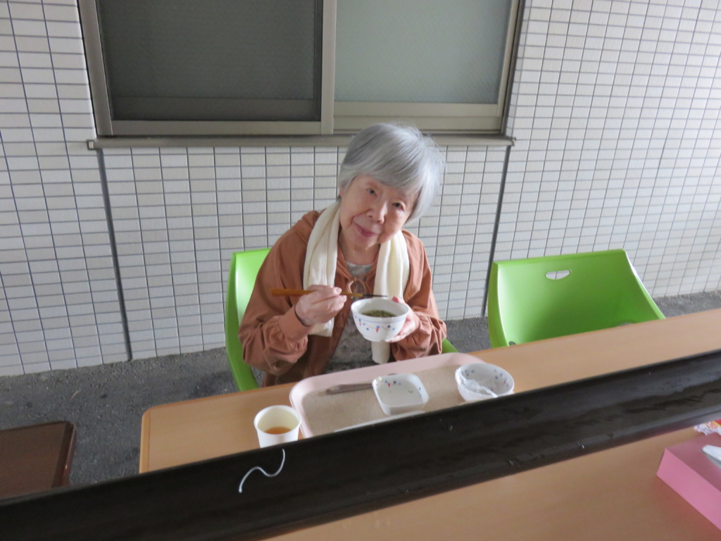そうめんを食べて美味しいとおっしゃる入居者D様。カメラ目線もバッチリです。